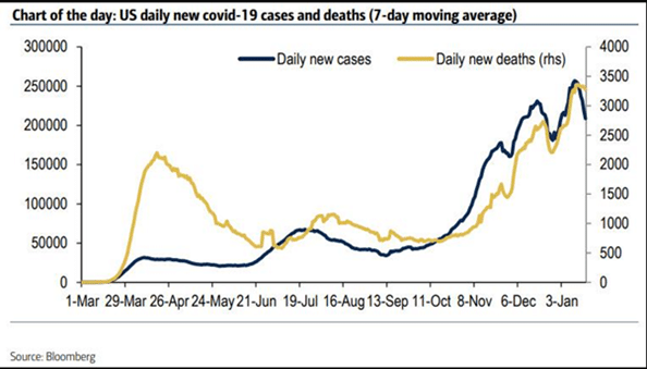 With Executive Orders from the new US administration seeking to accelerate the rollout of vaccines and the seeming peak in US COVID cases there was optimism this week from major Wall St analysts that we could be seeing “the beginning of the end of the COVID crisis” in the US.