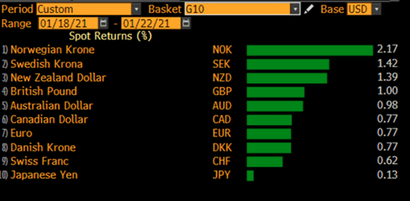 While record planned US stimulus helped push equities higher it also created a headwind for the US Dollar which continued its downtrend. All major currencies performed strongly against the greenback this week.