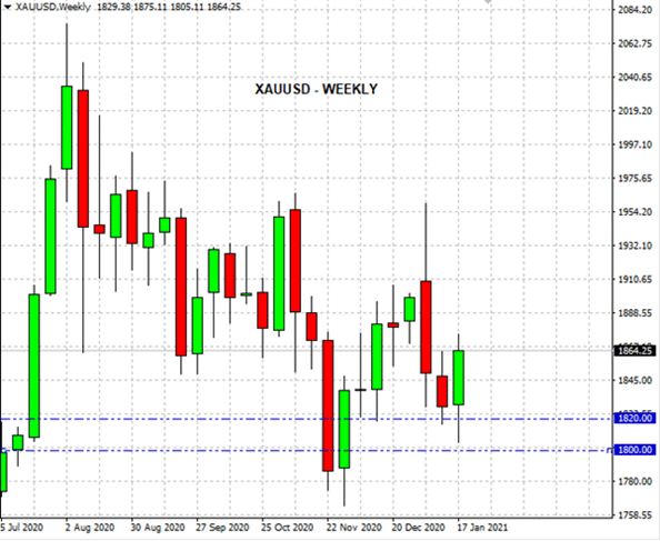 Spot gold (XAUUSD) had a strong week on the back of US dollar weakness and stimulus hopes, it bounced strongly from the 1820 -1800 support zone making 2 week highs and being up around 2% for the week at time of writing.