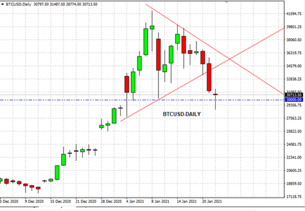 From a chart technician’s point of view, Bitcoin broke the lower barrier of the wedge pattern it has been consolidating in and has headed to the important 30000 support level.